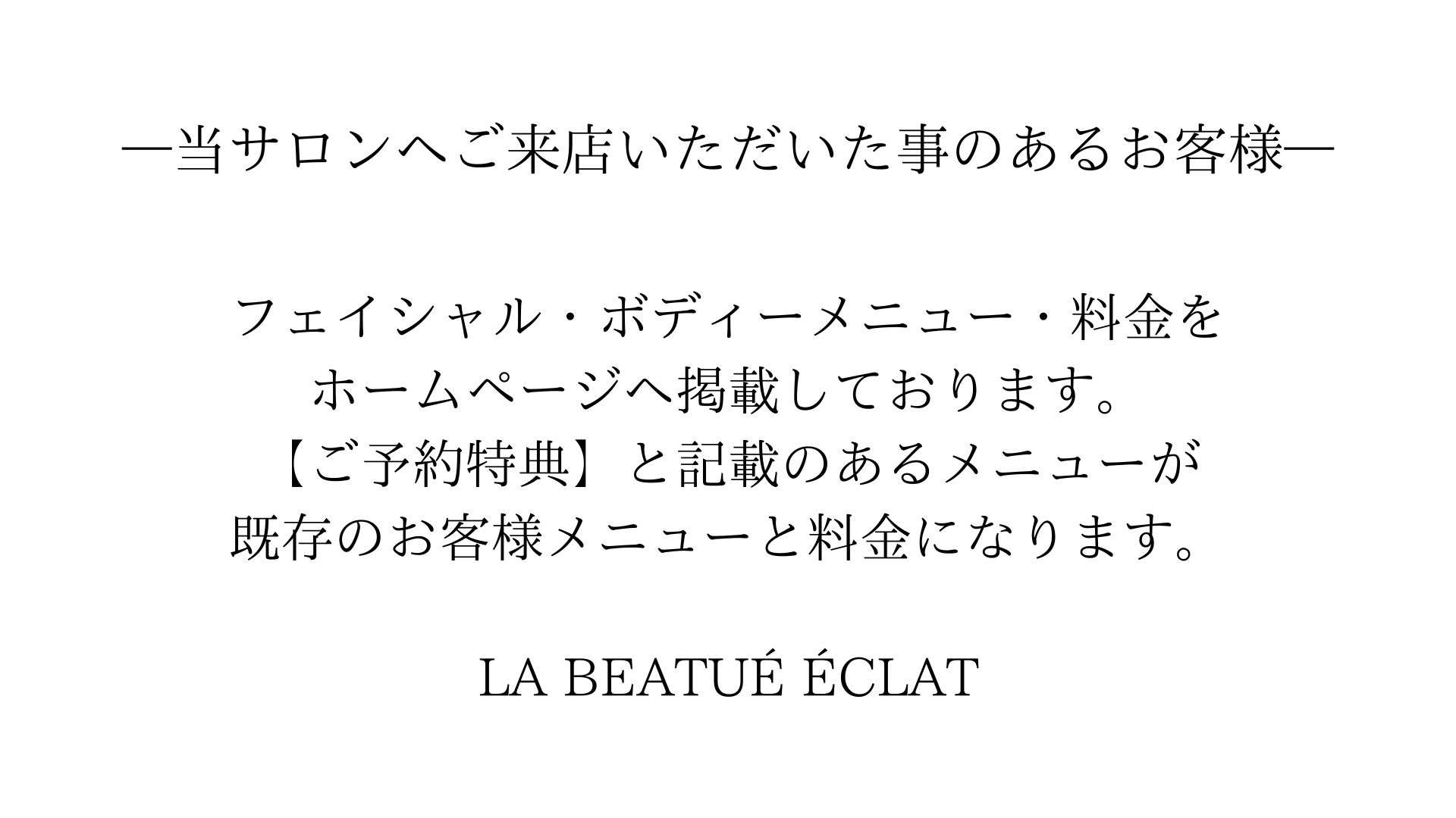 一休.com spa 掲載のお知らせ 2024/04/02 一休.comのご予約サイトに La beauté éclat (ラボーテエクラ) 掲載のお知らせ https://spa.ikyu.com/660332/?num=1 広々としたアットホームな店内にて満足度の高いサービスをゆったりとリラックスしながらご堪能いただけます。 オーナー兼エステティシャンは高い技術力を有しており、豊富な専門知識でもお客様の理想のコンディションをサポートいたします。明るくオープンな雰囲気のサロンで高クオリティーな仕上がりを楽しみたいとお考えのお客様は、ぜひ足をお運びください。 La beauté éclat(ラボーテエクラ)の予約なら[一休.comスパ] 無料カウンセリングはこちら フェイシャルトリートメント・料金 ボディートリートメント・料金 その他オプションメニュー・料金
